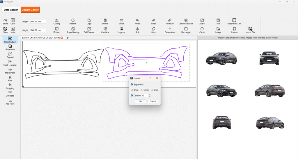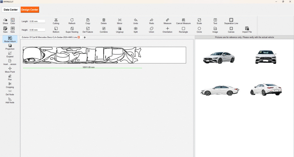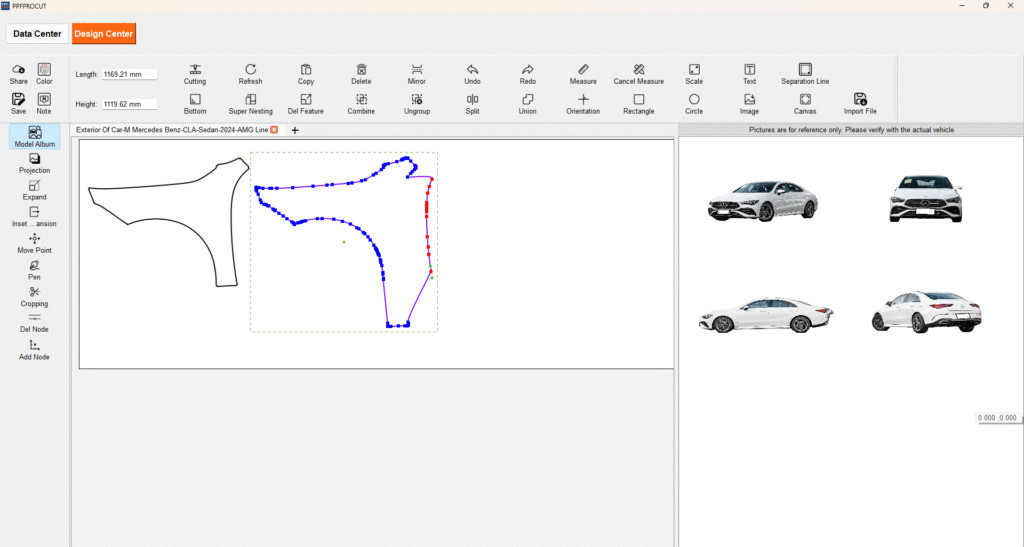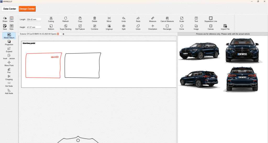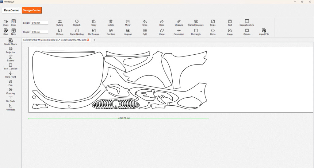 PPFPRO CUT™ to zaawansowane oprogramowanie stworzone specjalnie do projektowania i precyzyjnego cięcia folii PPF. System oferuje rozbudowaną bazę ponad 450 000 formatek, inteligentny moduł Super Nesting do optymalizacji zużycia materiału oraz zaawansowane narzędzia edycji wektorowej.